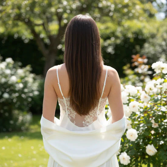 De Bruidsritueelbundel is de ultieme ontspanningsbehandeling vóór de bruiloft. De bundel bevat ons Bridal Deep Sleep Mask, zijden slipdress en zijden kimono, allemaal gemaakt van 100% hypoallergene zijde. Ontworpen om een diepere slaap te ondersteunen, je huid te voeden en je van 's avonds tot aan je jawoord in comfort te hullen. Goedgekeurd door dermatologen om irritatie, droogheid en puistjes te helpen voorkomen voor een frisse, stralende ochtend.